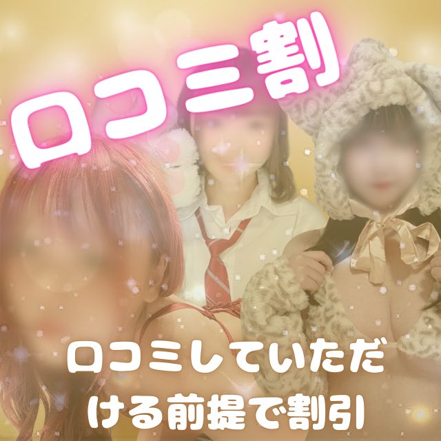 3/13 21:10 ★ 口コミ割 ★お客様を信じて先に割り引いちゃいます ★口コミ割★ ✨すべての女の子、お客様対象!✨口コミをしていただく事を前提で✨デリヘル60分コース➡75分15,000円✨✨デリヘル90分コース➡105分22,000円✨✨デリヘル120分コース➡135分28,000円✨※サービス後に口コミを必ずお願いいたします。